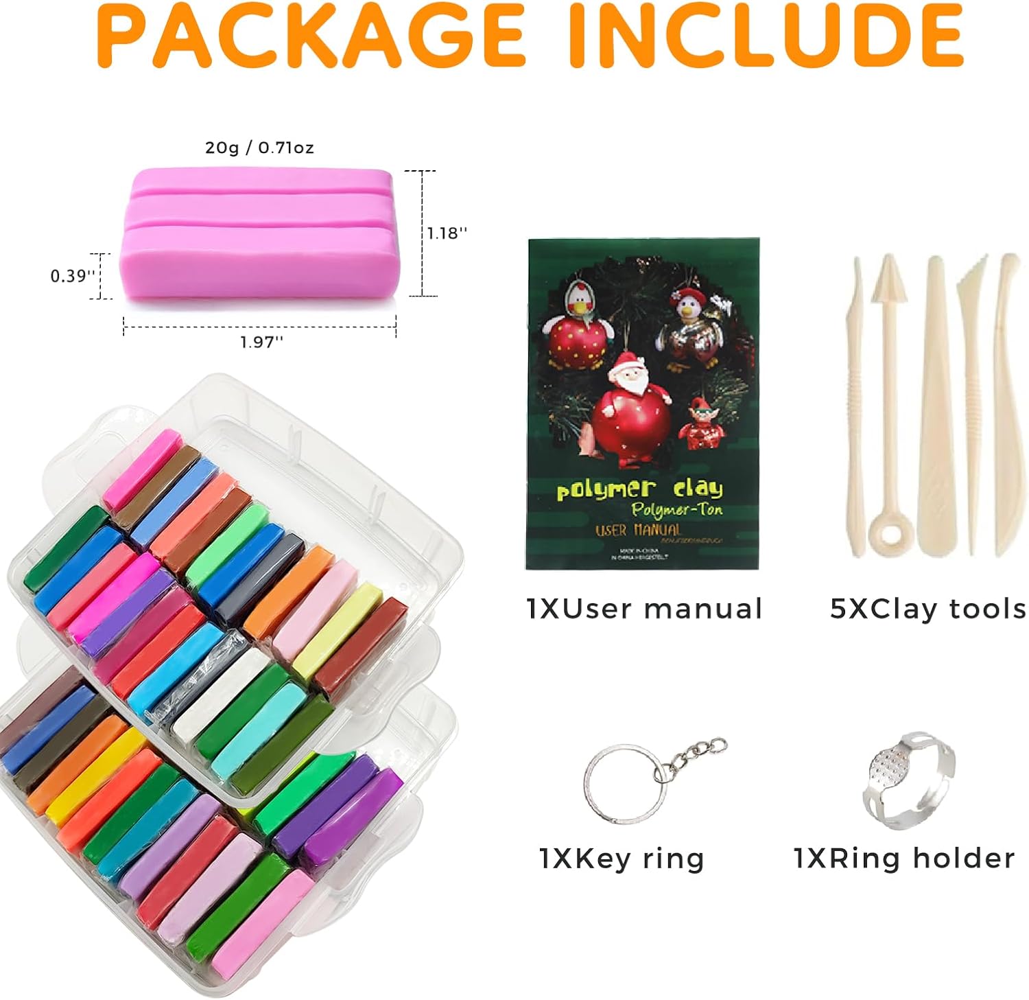 • Clay Set Including: This polymer clay set contains 50 bright colors with 5 clay tools and 31pcs accessories:1 user manual, 6 9-shape needle, 4 phone chain, 6 earhooks, 1 key ring, 1 brooch holder, 1 ring holder, 5 bead and 1 hairpin holder. Each size: 1.97’x1.18’x0.39′ , weight: 20g / 0.71oz