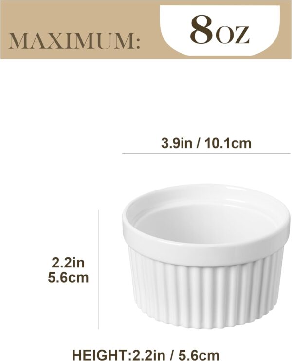 • 【PERFECT SIZE 】: 3.9 W x 2.2 H inches. 8 oz small ramekins are designed for souffle, crème brûlée, custards, desserts, ice cream and snacks, perfect for dipping sauce cups, charcuterie bowls