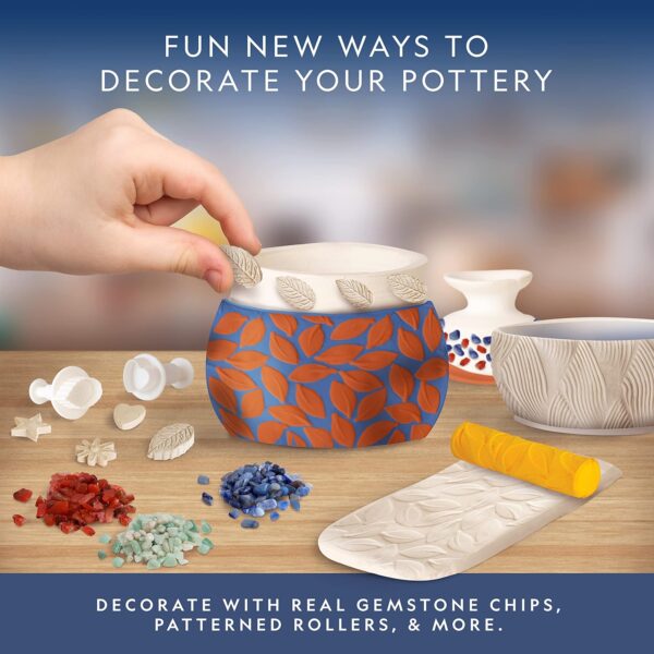 - FUN NEW WAYS TO DECORATE YOUR POTTERY – Explore new and exciting artistic possibilities with 2 pattern rollers, 5 push molds, assorted gemstones, 7 paint colors (including glow in the dark!) & more!