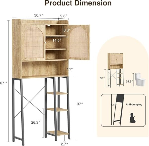 • REINFORCED STRUCTURE: The rattan toilet storage cabinet is made of solid P2 sheet material. The support frame is reinforced with an X-shaped metal crossbar structure and equipped with adjustable feet to ensure stability and prevent shaking. The anti-tipping accessories can firmly fix the toilet storage cabinet for improved safety