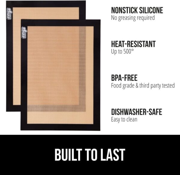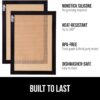 - DURABLE AND LONG LASTING: constructed from ultra durable, thick silicone, these silicone baking mats are designed to withstand daily usage; oven safe up to 500 degrees, the silicone baking mats can withstand high temperatures without worry; do not use on broil; slip resistant and won’t move around on pans; plus, its even baking surface helps prevent burned undersides; safe for use with metal utensils – do not use serrated edges