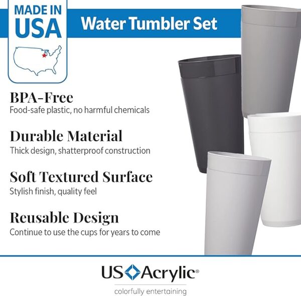 • Enjoy everyday drinks with confidence using our American-made stackable tumblers, a set of 12 20-ounce glasses designed for your convenience. Crafted from BPA-free durable plastic, these cups ensure safety without compromising quality, making them ideal for both indoor and outdoor use.
