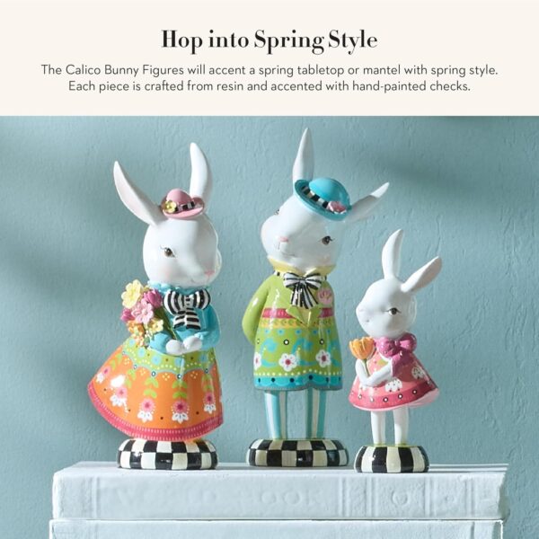 - ELEGANT SPRING DECOR: The Calico Bunny Figures Set features 3 small white bunny figures that are hand painted in colorful patterns and stand on black-and-white Courtly bases. This figurine family is a lovely way to adorn for the spring season.