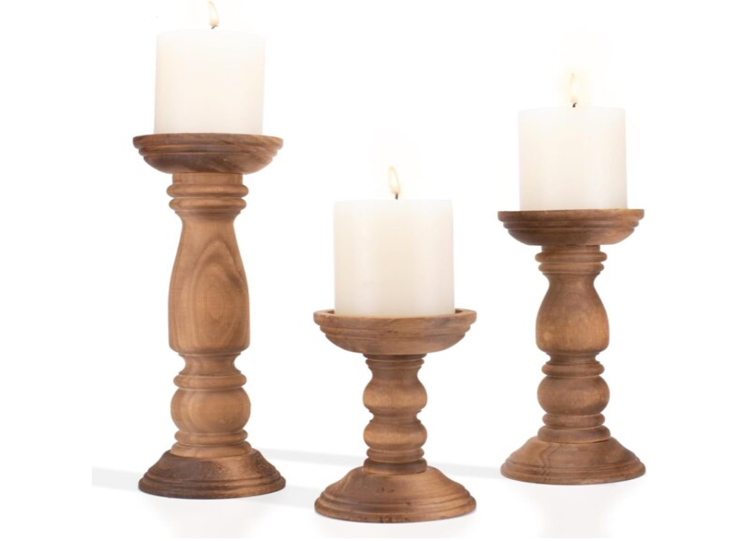 - Dimensions: S:12”×4”M:9”×4” L:6”× 4”. wooden candlesticks are perfectly proportioned, featuring varying heights that create an aesthetically pleasing set. They are perfect wood centerpieces for tables, as well as decorative pieces for fireplace mantel decor, coffee table decor, dining table decor.