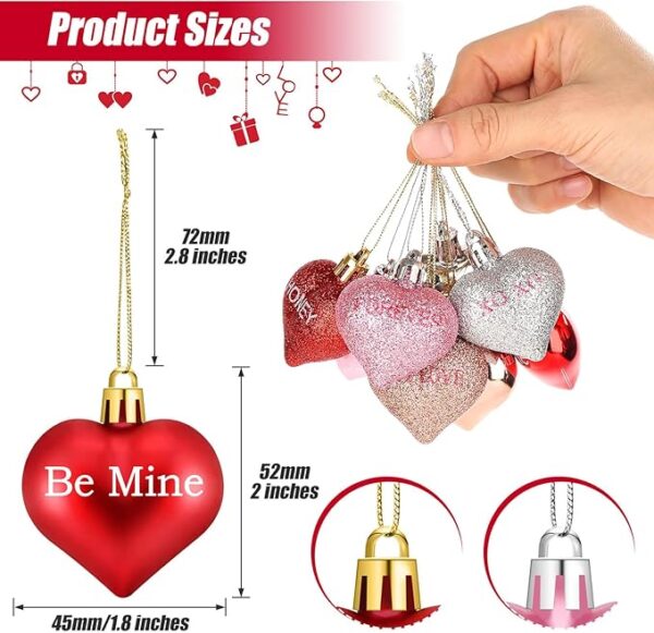 • Material and size: The heart baubles are made of plastic with lightweight, measures are about 4.5 x 5.0 cm/1.77 x 2.0 inches. The dainty and exquisite heart styles are suitable for Valentine’s Day decorations.