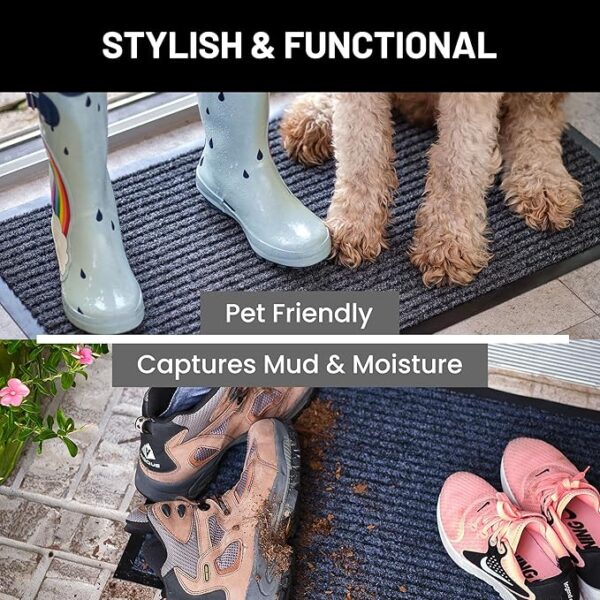 • Ideal Front Door Floor Mat Use: Indoor, outdoor, porch, kitchen, side, front door, entryway, hall, patio, garage, laundry, bathroom, dog mud, or any location that sees a good amount of foot traffic. Perfect for keeping your floors clean as the ribbed material helps scrape dirt and debris from shoes.