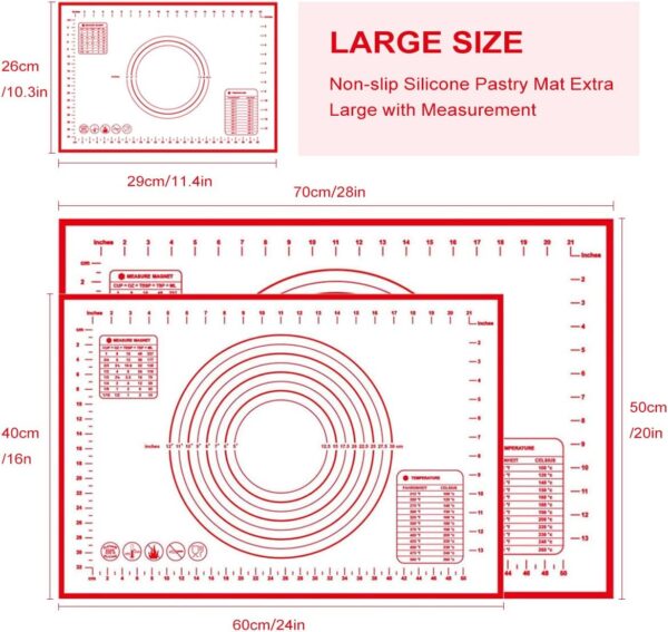 - 【Variety of Sizes】The baking mats size is 70×50cm (28×20in) 60*40cm(24*16inch) 29*26cm(10.3*11.4inch).The pastry baking mat is made of BPA-free food-grade silicone and reinforced with fiberglass. The silicone pastry mat is temperature resistant from -40°F (-40°C) to 450°F (230°C), which is safe to use in the oven, microwave, freezer or dishwasher.