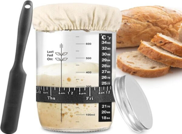 • Large capacity & easy to use. The sourdough jar has a 24 oz capacity and makes 3 sourdough loaves. You can easily add flour and water to this wide-mouth glass jar and remove the starter when needed. A spatula aids in the efficient stirring, and a temperature sticker helps you monitor the starter temperature in real-time. The Date/time feeding tape helps you keep track of time. Easy to observe and clean (dishwasher safe).
