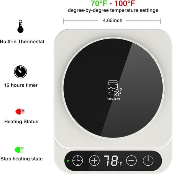 • Precision is key! Our device offers degree-by-degree temperature settings from 70-100°F, with a built-in sensor for real-time monitoring. The auto-warming on/off switch and 12-hour timer function allow you to easily adapt to changes in ambient temperature and jar thickness, ensuring optimal results every time.