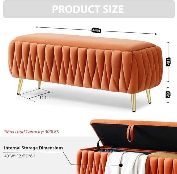 • Sturdy Build: The storage ottoman bench was well constructed with solid wood frame and solid metal legs, which ensures excellent stability support and a high weight capacity of 300 lbs.