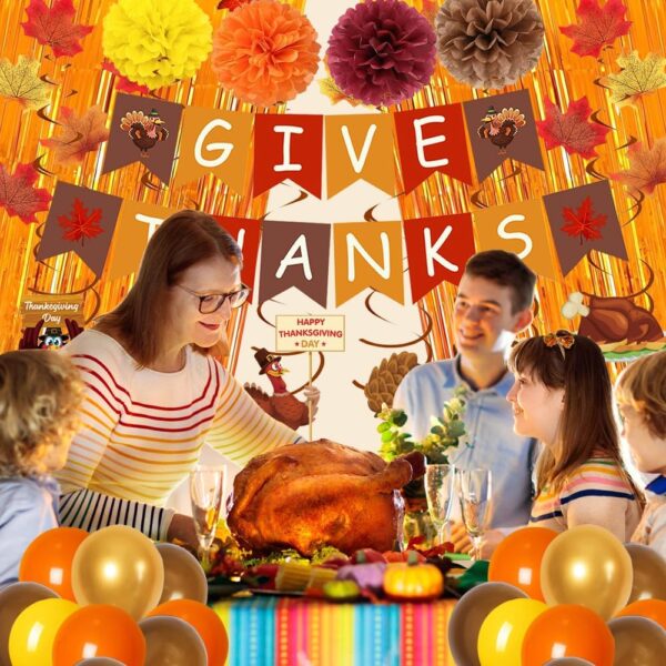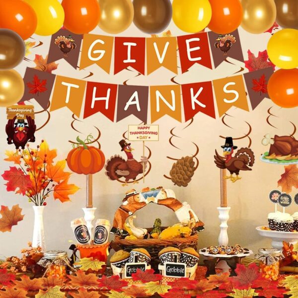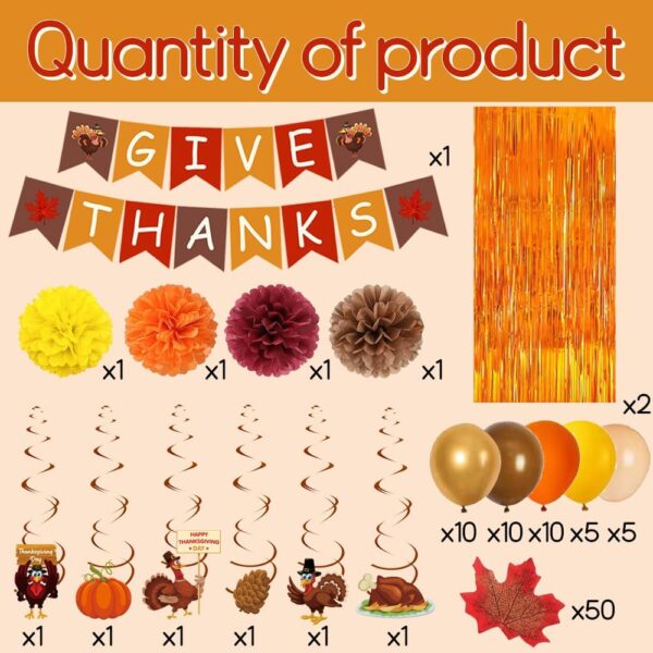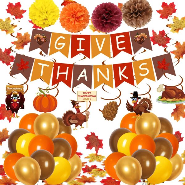 - Value-for-money Thanksgiving set: You will get a Thanksgiving banner, four 10-inch paper pom-poms of different colors, six spiral pendants, two orange tassel aluminum foil curtains, and ten 10-inch gold, brown, and orange balloons. Five each of 10-inch yellow and apricot balloons, and 50 simulated maple leaves. This package includes a variety of the Thanksgiving decorations you want, saving you a lot of time.